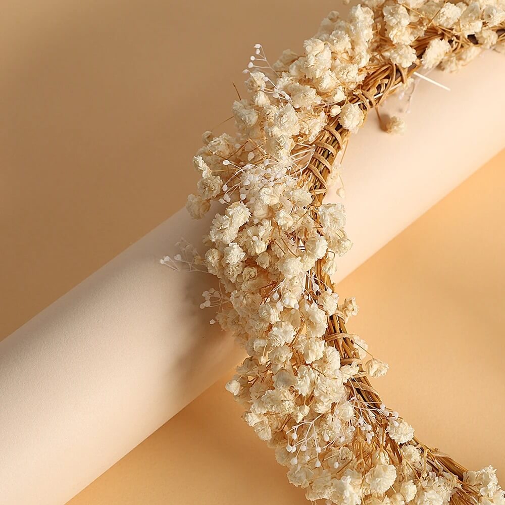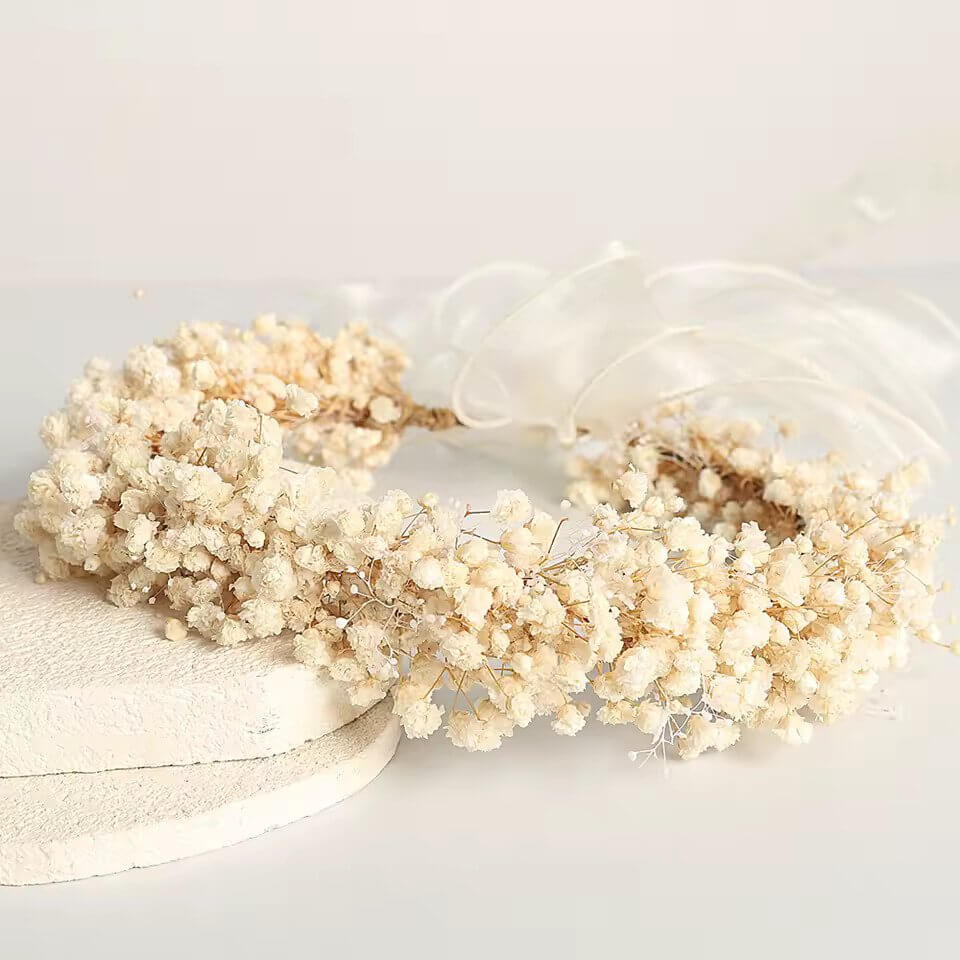 Er ist aus hochwertigen Trockenblumen gefertigt und behält seine Schönheit über lange Zeit. Mit dem Organza-Band auf der Rückseite lässt sich der Kranz leicht an den Kopf von Kindern oder Erwachsenen anpassen und verleiht ihm eine elegante Note. Zu einem hellen Kleid oder einem Kleid im Boho-Stil getragen, ist er das perfekte Accessoire, um ein festliches Outfit zu vervollständigen.