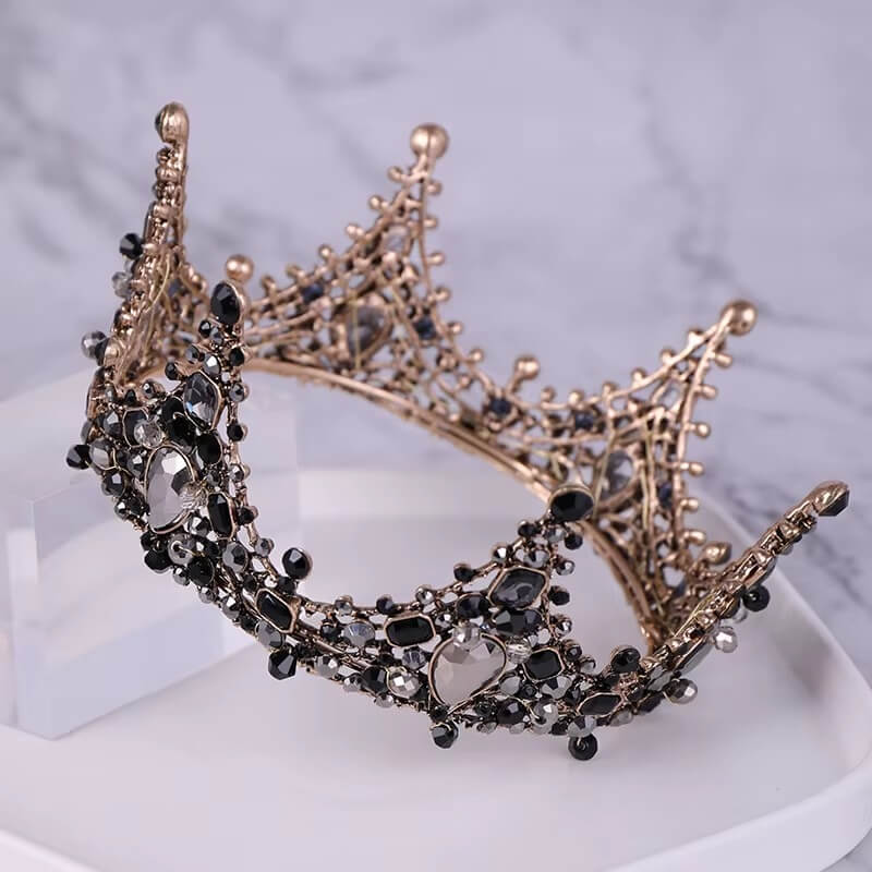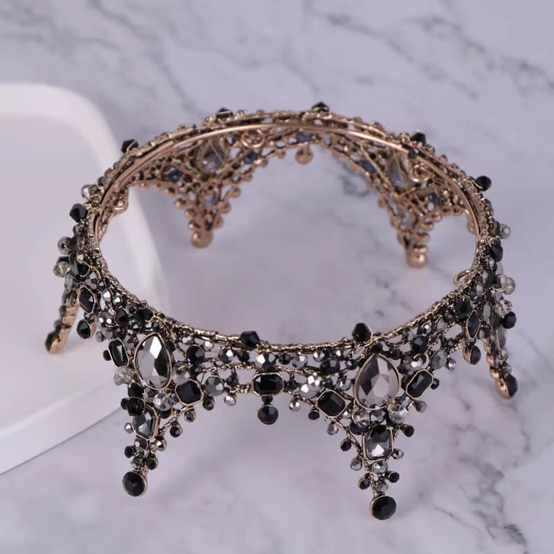 Diese schwarze Krone besticht durch ihren gewagten Stil und ihren ausgeprägten Charakter. Die dunklen Steine in Kombination mit den metallischen Details sorgen für einen starken und eleganten Kontrast. Jedes dunkle Element verleiht ihr einen Hauch von Geheimnis. Diese Krone bricht auf elegante Weise mit den klassischen Konventionen. Sie verleiht einen kraftvollen und originellen Look.