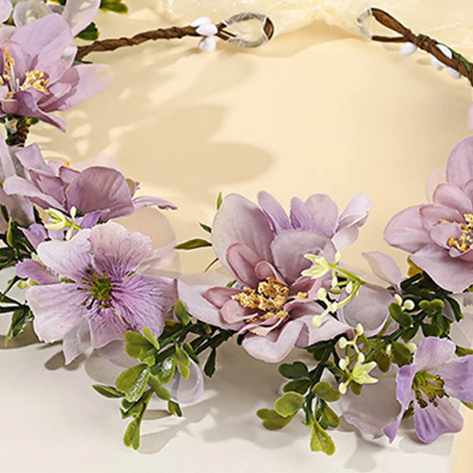 Verleihen Sie Ihrem Stil eine Bohème-Note mit diesem Kranz aus violetten Blumen, verziert mit grünem Laub. Seine farbenfrohen Blüten schaffen einen natürlichen und raffinierten Effekt, perfekt, um ein festliches Outfit zu ergänzen. Dank des verstellbaren Bands passt er sich leicht an jede Kopfform an und bleibt den ganzen Tag über angenehm zu tragen.